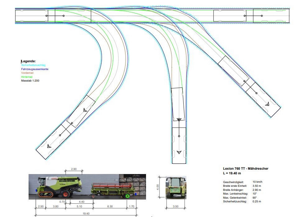 Bei der Projektierung von Strassen muss die Befahrbarkeit durch alle im Strassenverkehr zugelassenen Fahrzeuge sichergestellt werden. In den allermeisten Fällen wird laut dem Verband Landtechnik Schweiz die Befahrbarkeit einer Verkehrssituation mit den Massen von Lastwagen mit Anhängern beziehungsweise einem Lastenzug geprüft.