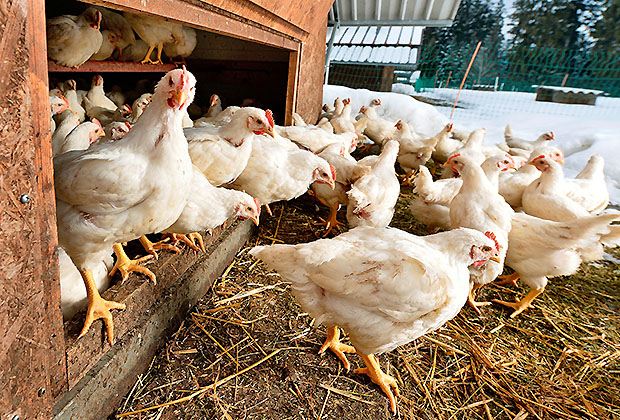 Durch Züchtung verwerten moderne Hühnerrassen ihr Futter – in erster Linie Weizen, Mais und Soja – deutlich effizienter als früher. Vor ein paar Jahrzehnten musste ein Huhn dreimal so viel fressen und brauchte doppelt so lange, um das Schlachtgewicht zu erreichen. Ein Poulet frisst heute rund 3,7 kg Futter, um ein Gewicht von 2,2 kg zu erreichen. Legehennen brauchen rund 120 Gramm Futter pro Tag, um 325 Eier in einem Jahr legen zu können; das sind rund 135 g pro Ei.