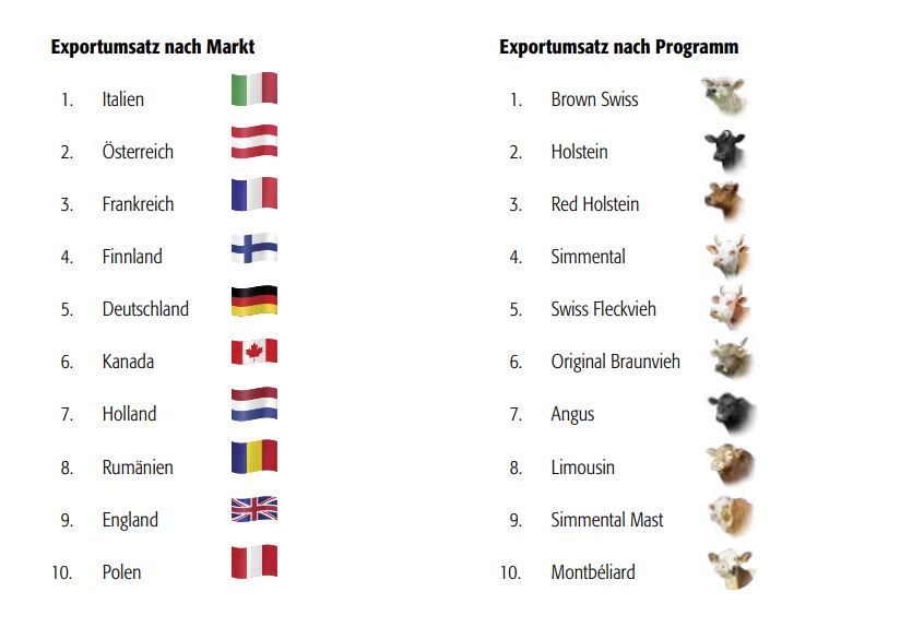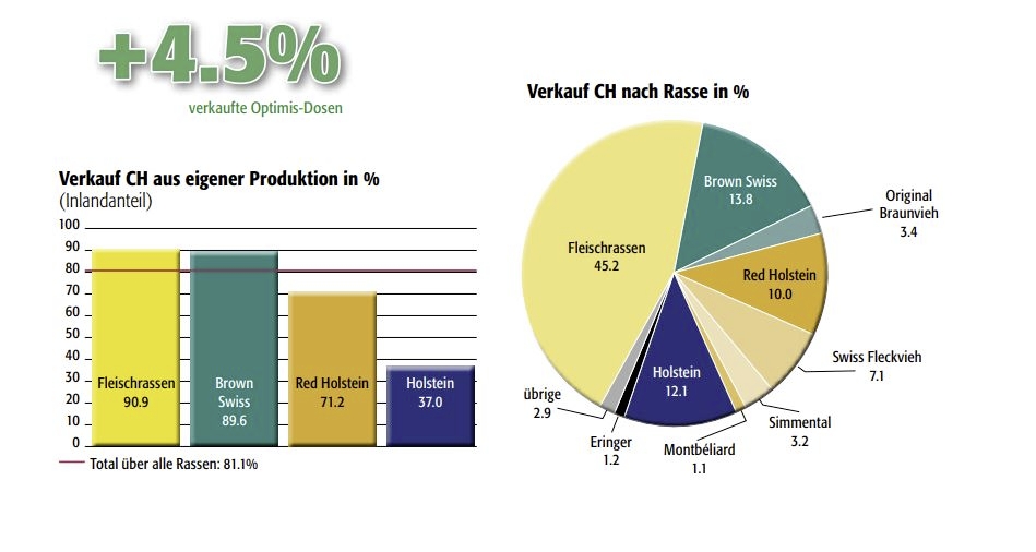 Der Verkaufsanteil der im Inland produzierten Samendosen lag gemäss Geschäftsbericht bei 81.1%, das ist 0.4% weniger als im Vorjahr. Bei den Milchrassen hat Brown Swiss mit 89.6% den höchsten Inlandanteil. Es folgen Red Holstein mit 71.2% und Holstein mit 37%. Den höchsten Inlandanteil verzeichneten die Fleischrassen-Stiere mit 90.9% (+0.3%). «Bei Red Holstein resultierte, dank einem sehr guten Stierenangebot, eine Zunahme von 4.8% gegenüber dem Vorjahr», heisst es im Bericht.