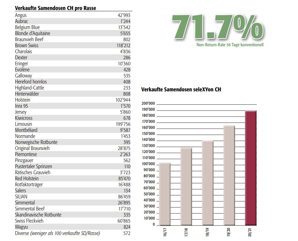 Erfolgreich ist Swissgenetics weiterhin bei den seleXYon-Dosen (gesexte Samendosen). Hier wurde im Vergleich zum Vorjahr ein fulminantes Wachstum von 14.8% erreicht. Insgesamt wurden 244'000 Dosen (2020: 203'000) abgesetzt. Damit erreichen die gesexten Samendosen einen Anteil von 41% bei den Milch- und Zweinutzungsrassen.