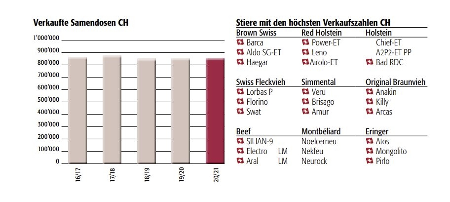 Insgesamt hatte Swissgenetics von rund 1'700 verschiedenen Stieren Samendosen im Sortiment. «Allerdings konzentriert sich die Anzahl der Stiere mit einem grossen Marktvolumen zunehmend», schreibt das Unternehmen. So liefern 10% der im Angebot stehenden Stiere 80% der verkauften Samendosen.