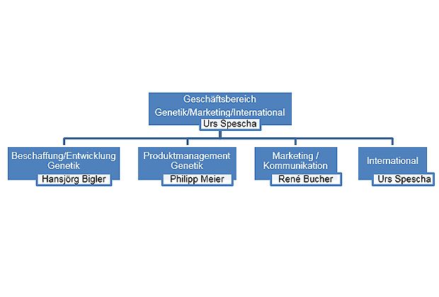 Innerhalb des neuen Geschäftsbereichs „Genetik und Vermarktung“ wird Hansjörg Bigler Teamleiter von „Beschaffung und Genetik“. Er wird damit nicht wie im vergangenen Dezember angekündigt Swissgenetics verlassen und die Stelle als neuer Leiter des Verlages Edition-lmz (früher Landwirtschaftliche Lehrmittelzentrale) antreten. Teamleiter Produktmanagement wird Philipp Meier. Er kehrt zu Swissgenetics zurück. Teamleiter des Bereichs Marketing/Kommunikation bleibt René Bucher, Urs Spescha wird weiterhin die Teamleitung im Bereich „International“ ausüben.