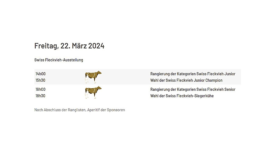 Die Expo Bulle wird am Freitag um 14.00 Uhr mit den Junior-Kategorien mit der Rasse Swiss Fleckvieh eröffnet, gefolgt von den Senior-Kategorien. Die Champion dieser Rasse wird am späten Nachmittag gekürt. Ab 19.30 Uhr werden die 43 Lose der Swiss National Sale vor Ort präsentiert. «Die Swiss National Sale ist eine Verkaufsplattform für qualitativ hochwertige Tiere aus der ganzen Schweiz, die es den Käufern ermöglicht, in Tiere aus tiefen Kuhfamilien sowie in Tiere mit attraktiven Zuchtwerten zu investieren», schreiben die Organisatoren.