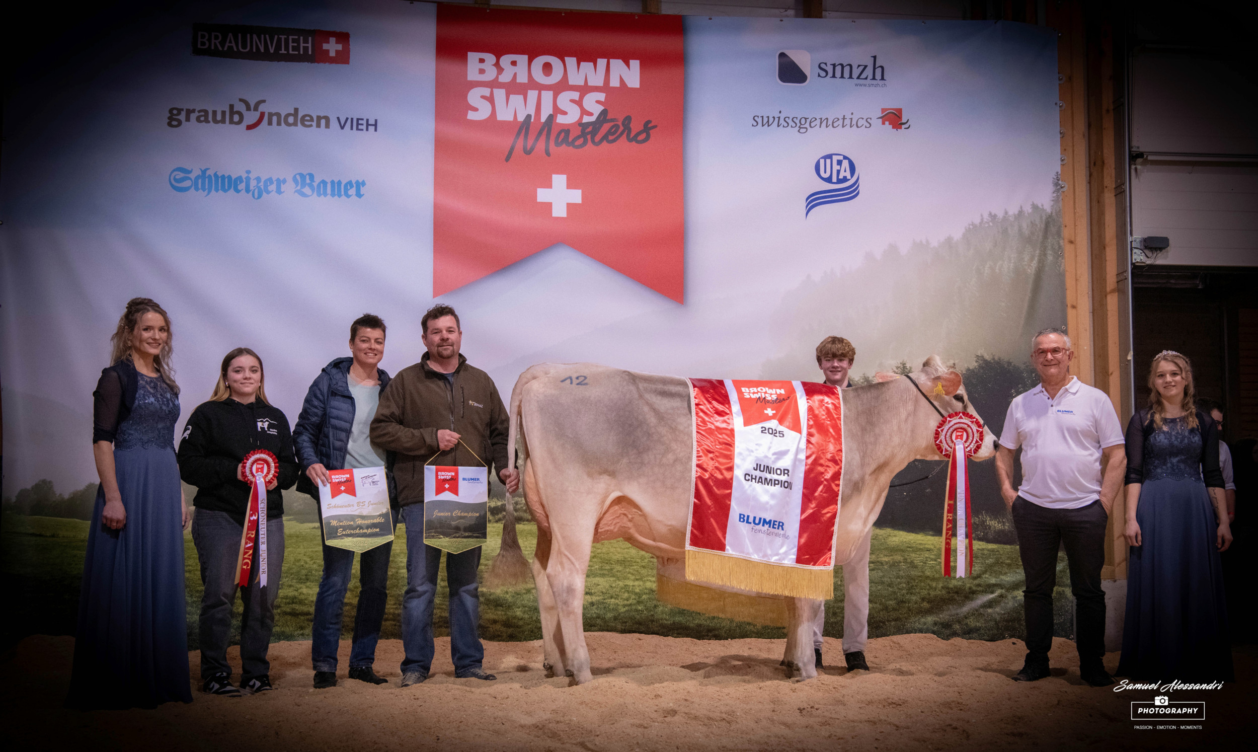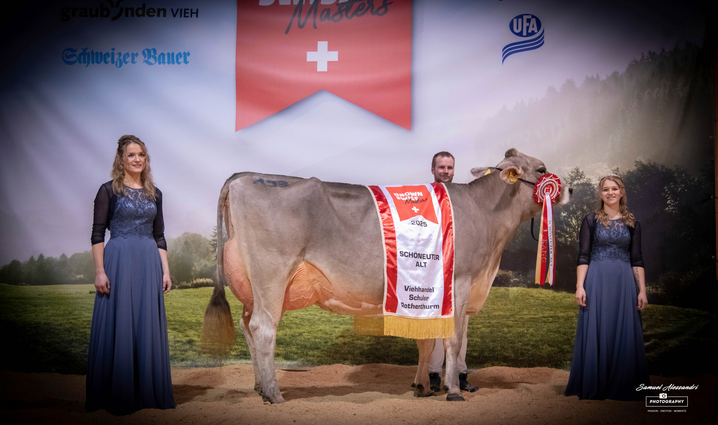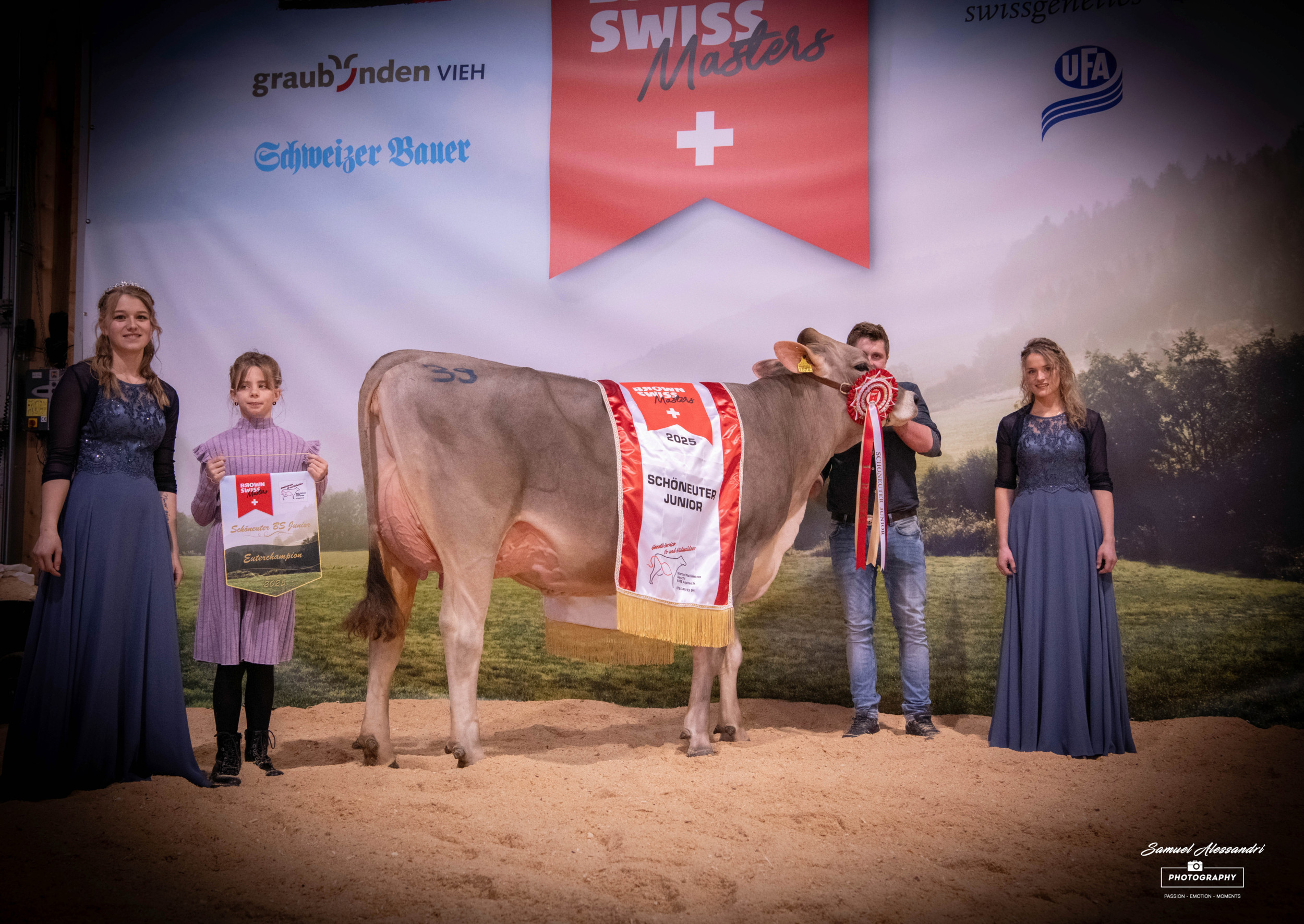 Somit stellte sie dabei Cabalzar’s Swizzero Berna auf den Reserveplatz: Die Swizzero-Tochter gewann vor knapp einem Jahr im Rahmen der Europaschau in Imst (AU) den Schöneutertitel bei den mittleren Kühen gewann und blieb in den letzten Monaten auf nationaler Ebene in einer unglaublichen Erfolgsserie an diversen Schauen ungeschlagen. So wurde sie zuletzt auch an der Swiss Classic 2024 und der IGBS-Schau 2025 zum Grand Champion erkoren. Dank ihrer besseren Strichstellung und -ausprägung konnte Berna vor Phil Estell von Martin Wallimann aus Alpnach Dorf OW überzeugen, welche in Vergangenheit ebenfalls immer wieder an vorderster Front mitgemischt hat und einige Champion-Titel nach Hause geholt hat.