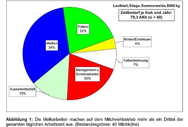 In der Milchviehhaltung zählen die Melkarbeiten zu den wichtigsten Tätigkeiten im Tagesverlauf. Mehr als ein Drittel der gesamten täglichen Arbeitszeit wird beim Melken aufgewendet (siehe Abb. 1). Die sorgfältige Arbeitserledigung beim Melkvorgang ist besonders wichtig. Schliesslich handelt es sich hier an der direkten Schnittstelle zwischen Mensch, Kuh und Technik um die Erzeugung des Lebensmittels Milch.