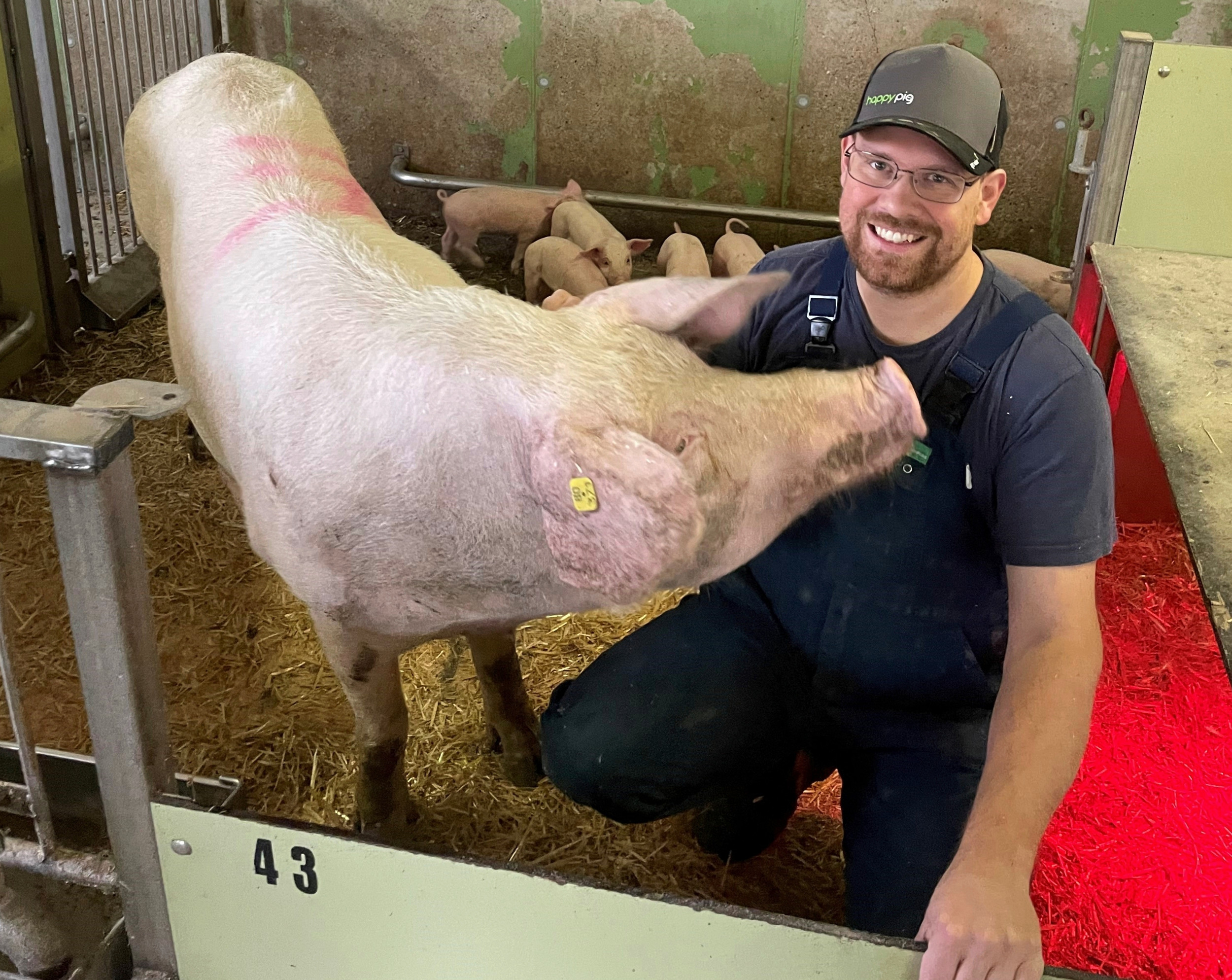 Roman Jud mit einer seiner Landrassesauen. An der norwegischen Genetik schätzt er den angenehmen Charakter.