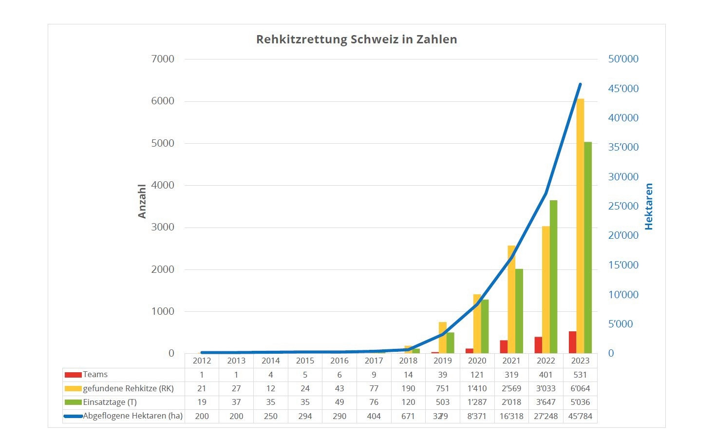Die Rehgeissen verstecken ihre Kitze im hohen Gras vor Feinden. Die Jungtiere verfügen in dieser Lebensphase über einen Duckinstinkt. Was ihnen Schutz bietet, bringt sie auch in Lebensgefahr. «Die Landwirte müssen gleichzeitig ihre Wiesen mähen, was im langfristigen Durchschnitt zu rund 1500 von Landmaschinen getöteten Rehkitzen im Jahr führt», schreibt Rehkitzrettung Schweiz. Fachleute gehen aber von einer hohen Dunkelziffer aus. Sie vermuten mehrere tausend Rehkitze pro Jahr.