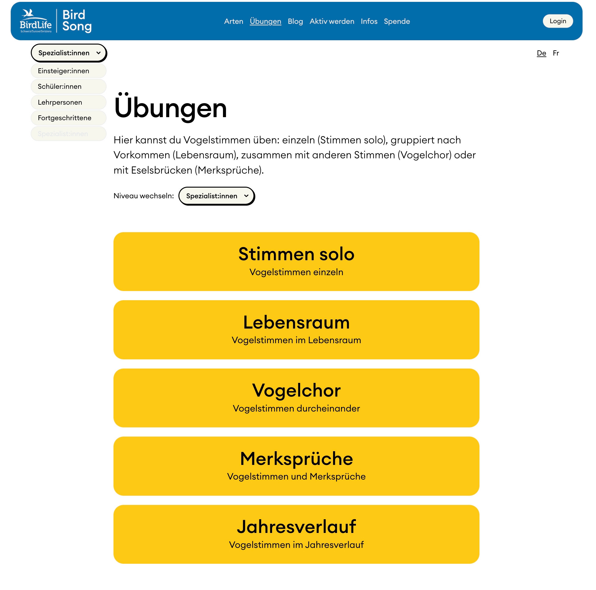 Für jeden gibt es passend zum Kenntnisstand unterschiedliche Übungen. Die Website zeigt je nach Erfahrungsniveau individuell zugeschnittene Inhalte und bietet regelmässig neue Rätsel rund um den Vogelgesang an. Zudem können Beiträge zur Vogelstimmenwelt nachgelesen werden.