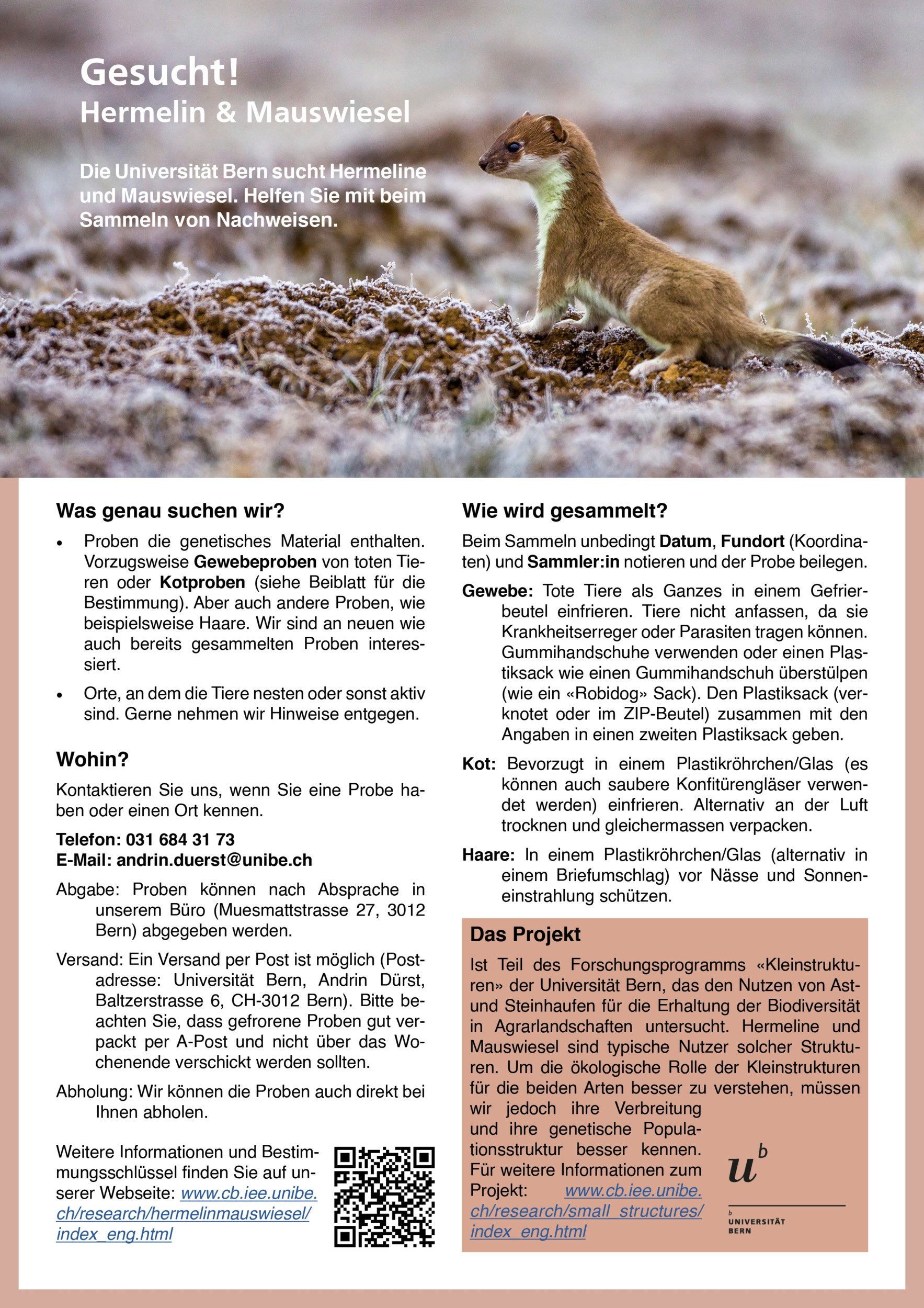 Die Uni Bern sucht genetisches Material von Hermelinen und Mauswieseln.