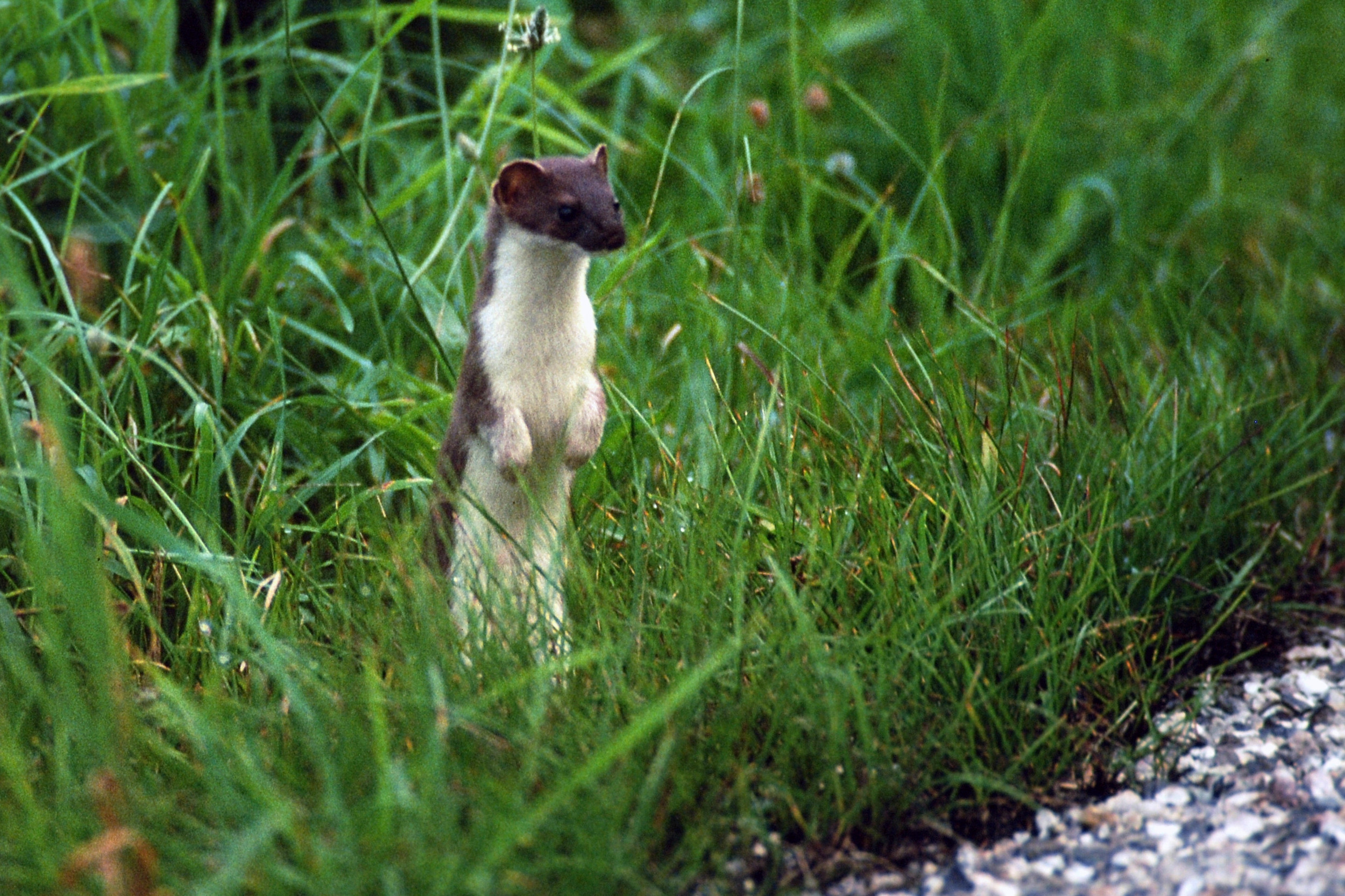 Der Hermelin ist das grössere der beiden Wieselarten. Er ist auch bekannt als Grosses Wiesel oder Kurzschwanzwiesel. Im Sommer ist ihr Fell oben braun und an den Seiten und am Bauch gelblich-weiss. Im Winter wechselt das Fell zu einem dichten, weissen Pelz, mit Ausnahme einer schwarzen Schwanzspitze.