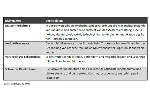 Swissness kann gemäss Strategie keine eigenständige Positionierung darstellen. Wichtig sei die Swissness als Treiber für die Markenwahl. Um die Alleinstellungsmerkmale zu erhalten, benötigt es aus der Sicht der BOM ein Überwachungsinstrument. Als Risikoaspekt wird bei raufutterbasierten Fütterung beispielsweise der steigende Kraftfuttereinsatz infolge steigender Grundfutterpreise genannt.