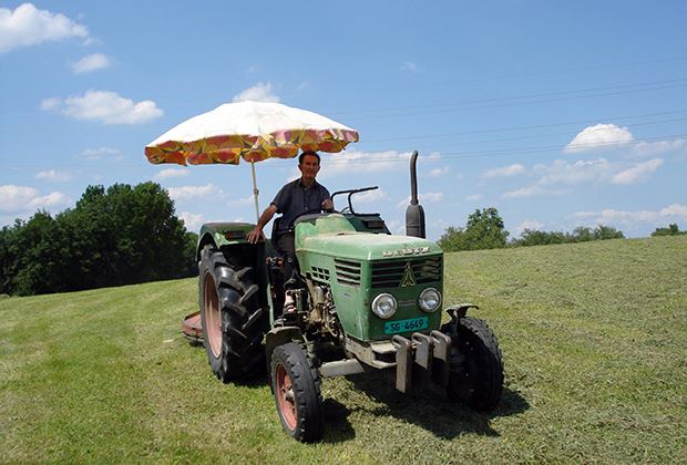 Auch der Mäher braucht bei dieser Hitze eine kurze Pause.