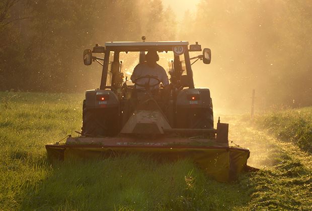 Bei Sonnenuntergang wird Emd gemäht. (Spätsommer 2016) Der Traktor hat ein Wendegetriebe, deshalb kann er mit dem Mähwerk rückwärts «vorwärts» fahren.