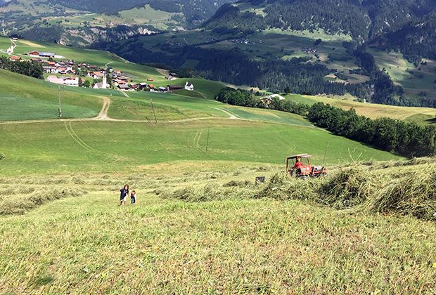 Heuet im Steilhang, mit toller Aussicht im Bündnerland. "Der alte Metrac kennt den Weg schon fast alleine. Und auch die Kinder klettern wie die Ziegen" ergänzt Judith Caduff ihre Einsendung.