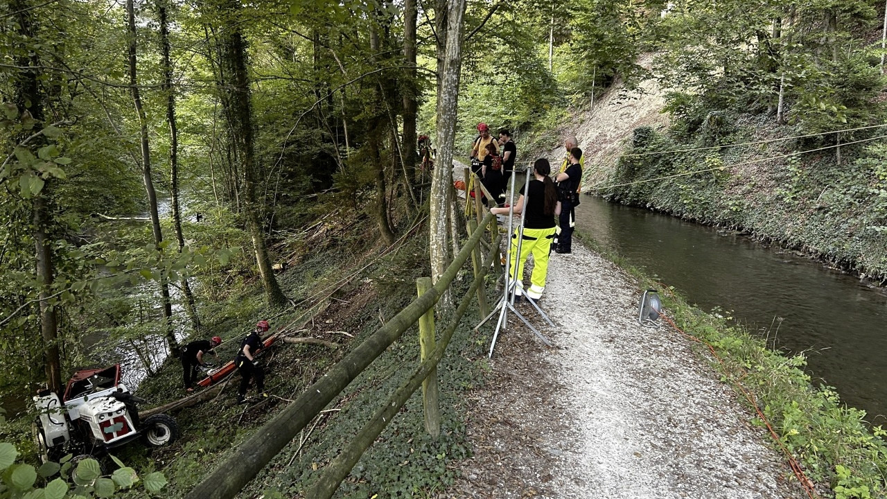 Zur Sicherung und Bergung des beschädigten Traktors im unwegsamen Gelände wurde neben dem Abschleppdienst auch die Feuerwehr aufgeboten. Die aufwändigen Arbeiten mussten auf Montag vertagt werden.