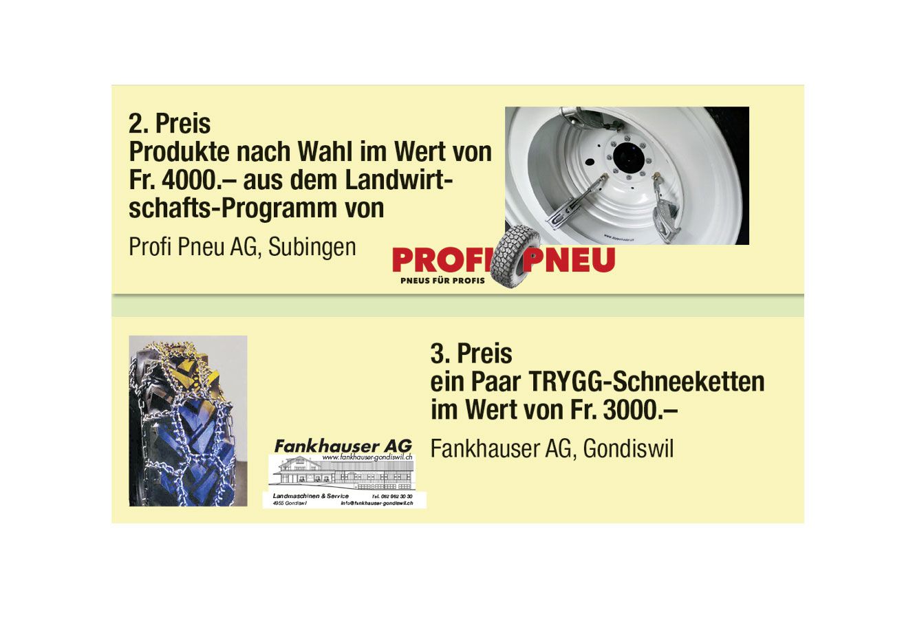 Alle zwei Jahre wird der Wettbewerb «Traktor des Jahres» durchgeführt. Sie, liebe Leserinnen und Leser, haben die Möglichkeit, Ihrem Traktor, Ihrem Bergtraktor, Ihrem Hoflader sowie Ihrem Teleskoplader des Jahres die Stimmen zu geben. Mit ein wenig Glück gewinnen Sie ausserdem einen tollen Preise.