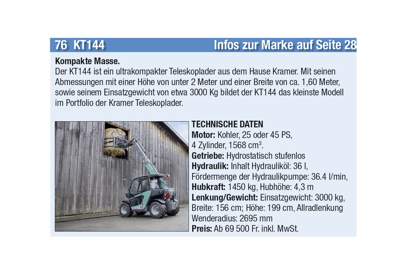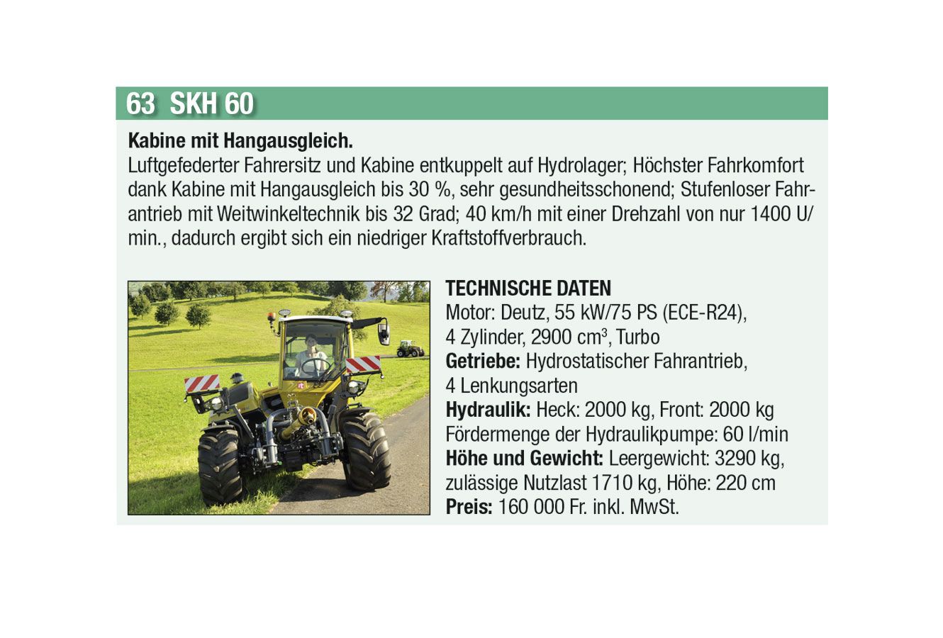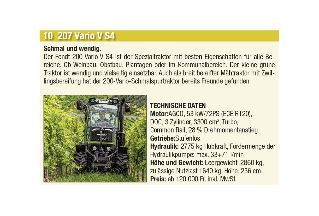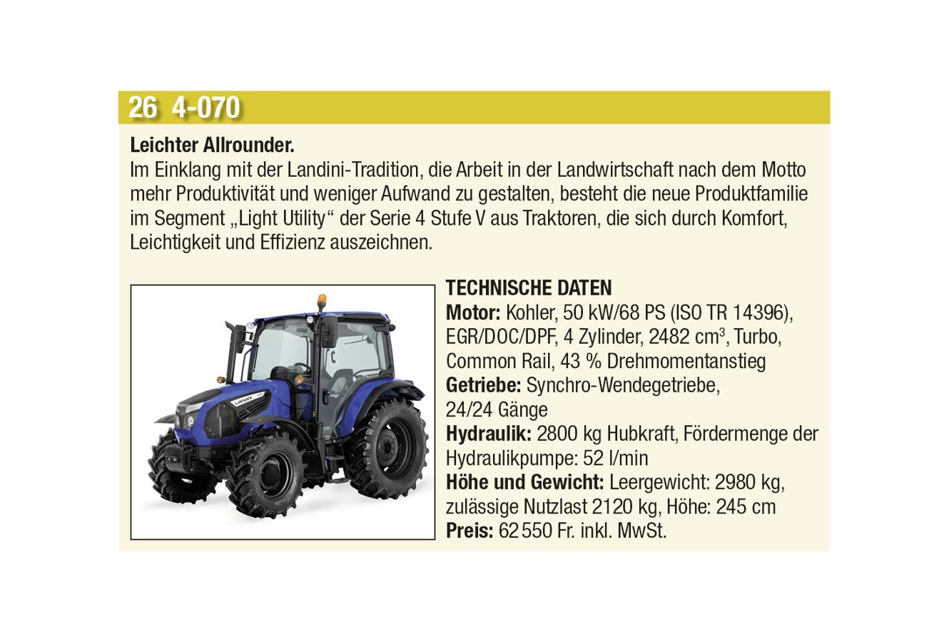 Die automatische Kommunikation und Abstimmung zwischen Traktor und Anbaugeräten sowie beim Überladen von Erntemaschinen auf Transportfahrzeuge wird immer wichtiger. Heute hat aber auch jeder Anbieter einen Allrounder mit einfacher Ausstattung im Programm. Stark zugenommen hat auch das Angebot an Hofladern jeder Grösse, oft mit batterie-elektrischen Antrieben. Auch der erste elektrisch angetriebene Traktor hat es in diese Ausgabe geschafft.