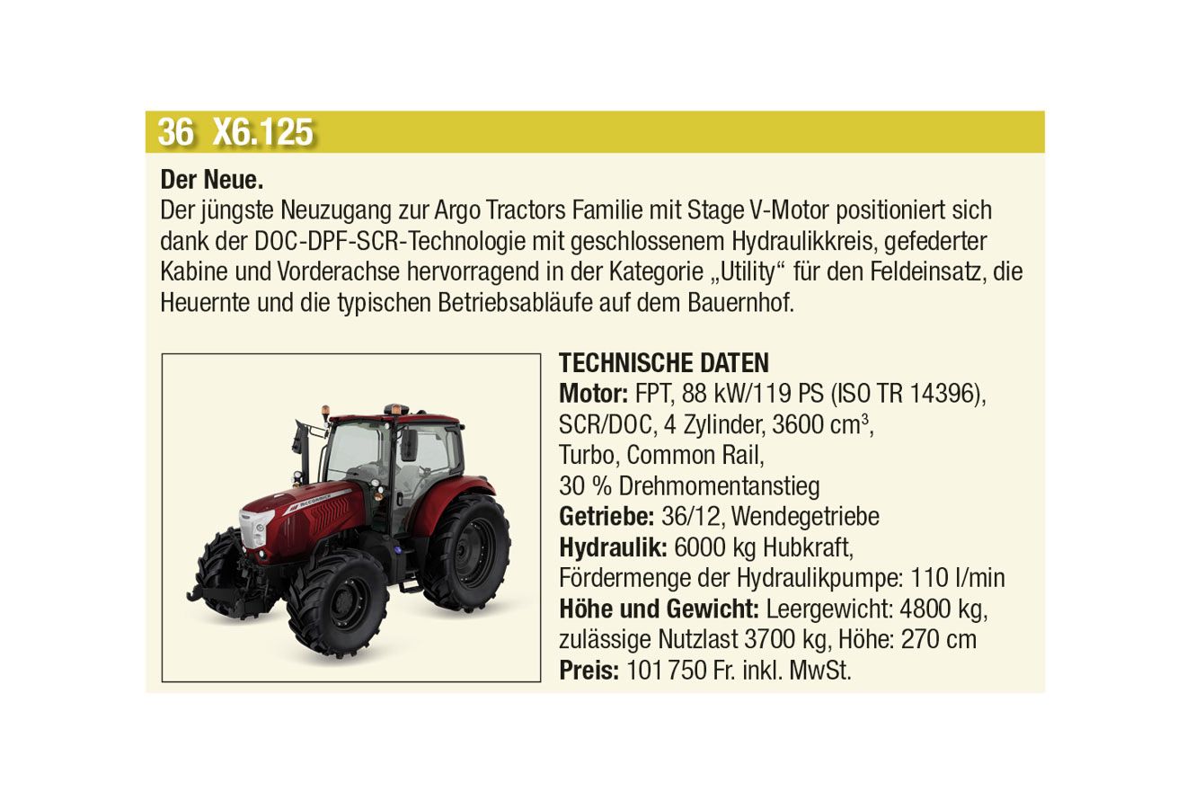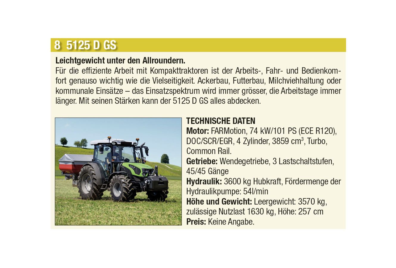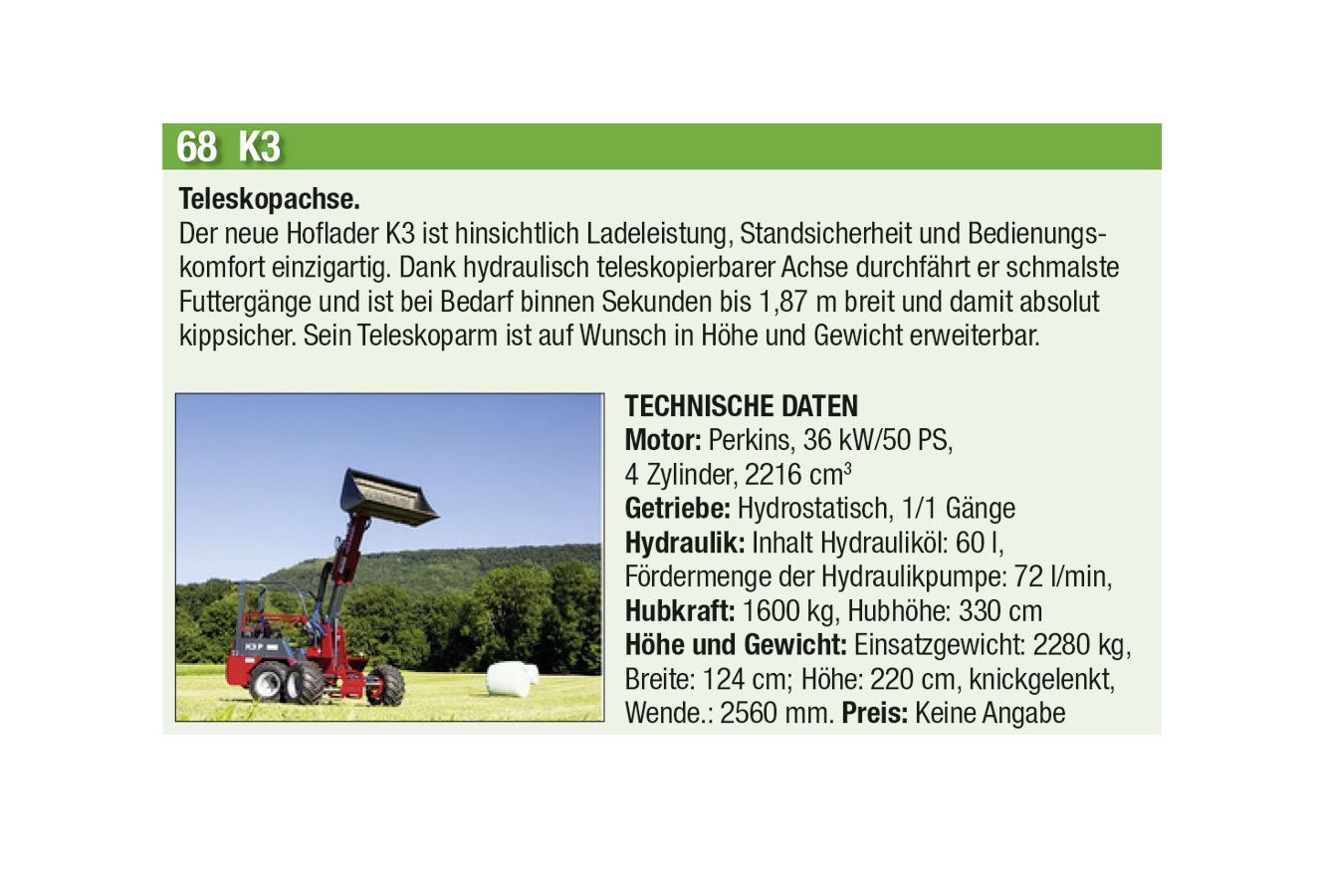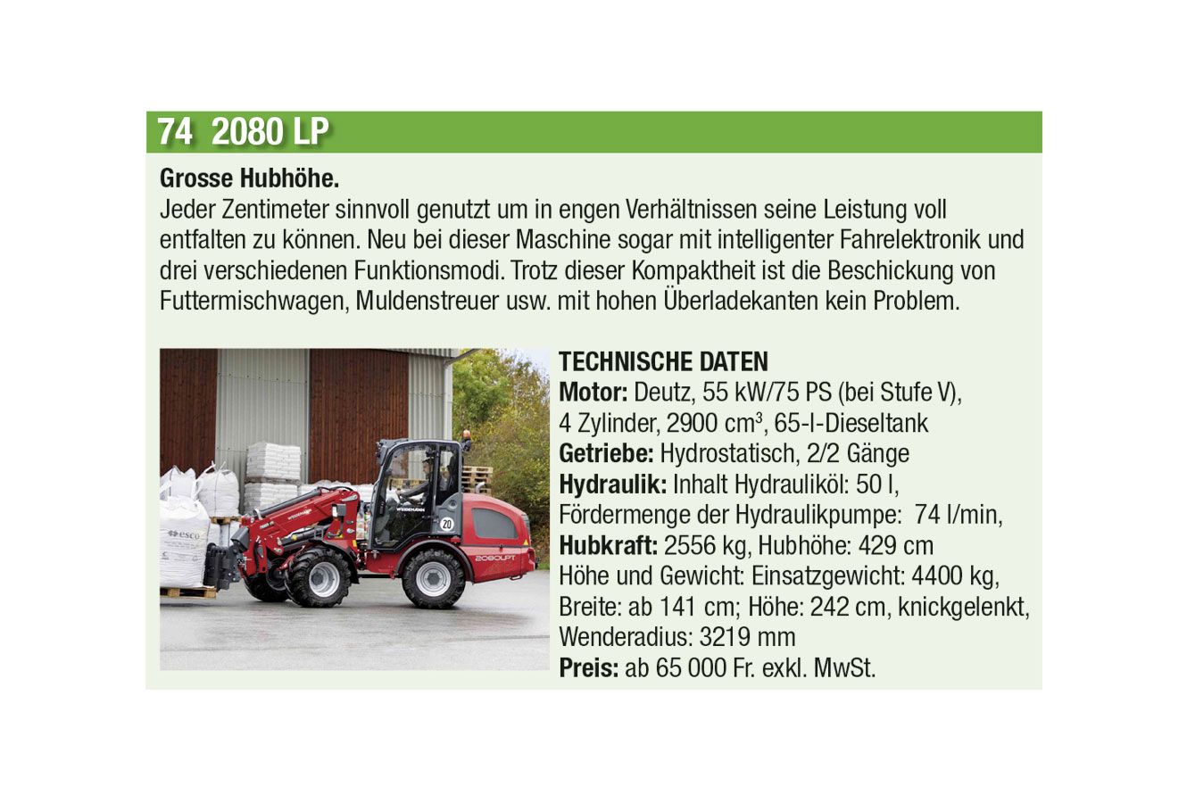 Die automatische Kommunikation und Abstimmung zwischen Traktor und Anbaugeräten sowie beim Überladen von Erntemaschinen auf Transportfahrzeuge wird immer wichtiger. Heute hat aber auch jeder Anbieter einen Allrounder mit einfacher Ausstattung im Programm. Stark zugenommen hat auch das Angebot an Hofladern jeder Grösse, oft mit batterie-elektrischen Antrieben. Auch der erste elektrisch angetriebene Traktor hat es in diese Ausgabe geschafft.