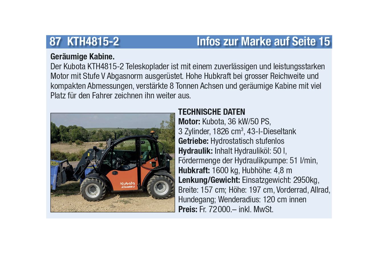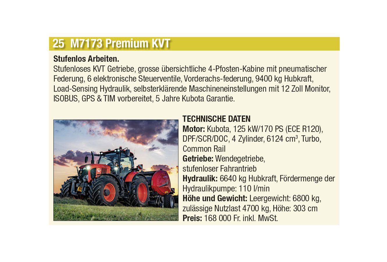Sie können auswählen zwischen 54 Traktoren, 9 Bergtraktoren, 11 Hofladern und 13 Hofladern. Beim Voting können aus den vier Kategorien je ein Fahrzeug auswählen. Vielleicht gewinnen gerade Sie den Aufsitzmäher Kubota Z122R im Wert von 7500 Franken oder einen der anderen wertvollen Preise! Das Voting endet am 24. Januar 2023. Wir wünschen Euch viel Glück.