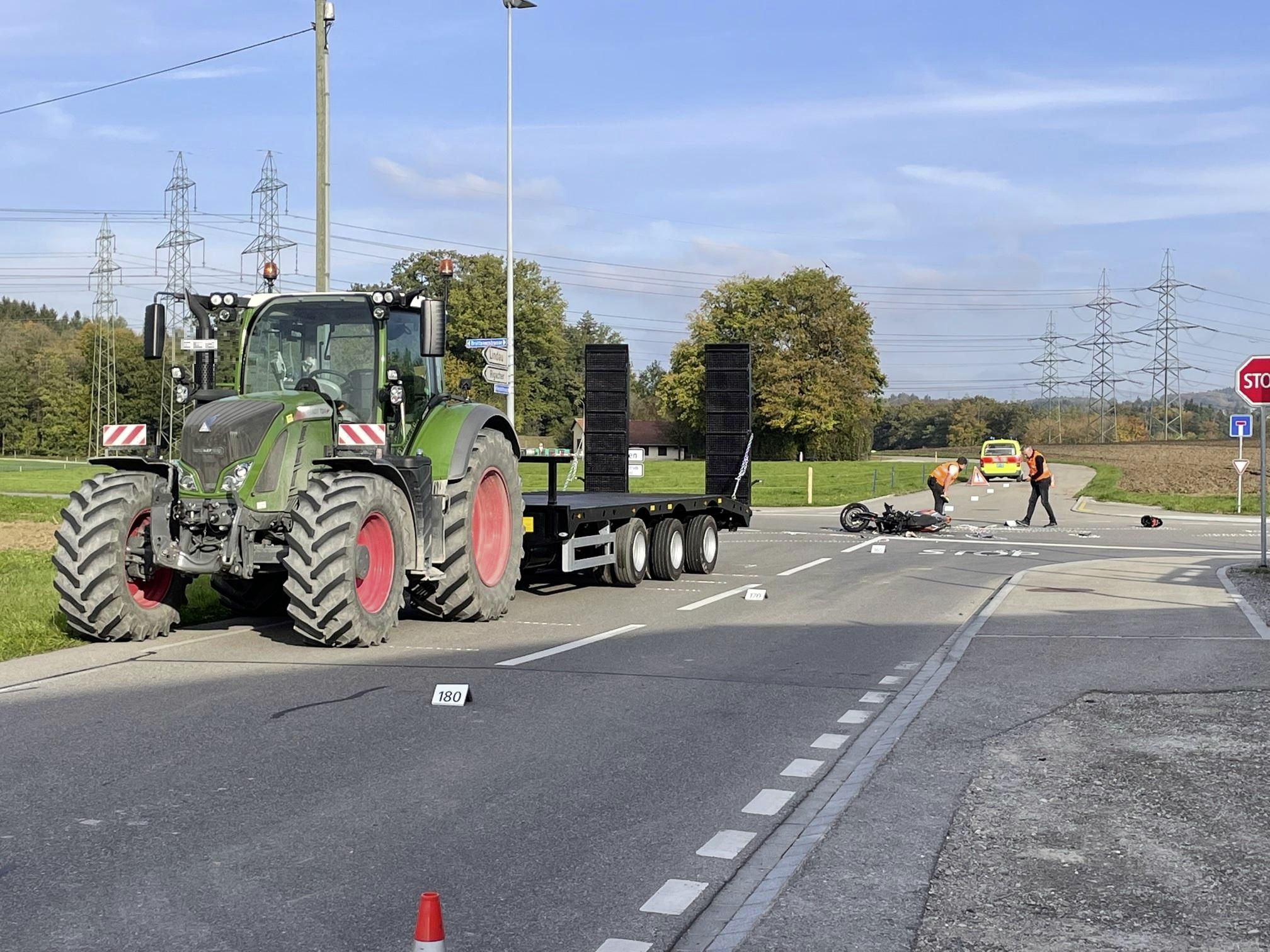 Bei einem Verkehrsunfall zwischen einem Traktor mit Anhänger und einem Motorrad ist am Mittwochnachmittag in Lindau ZH der Motorradlenker schwer verletzt worden.