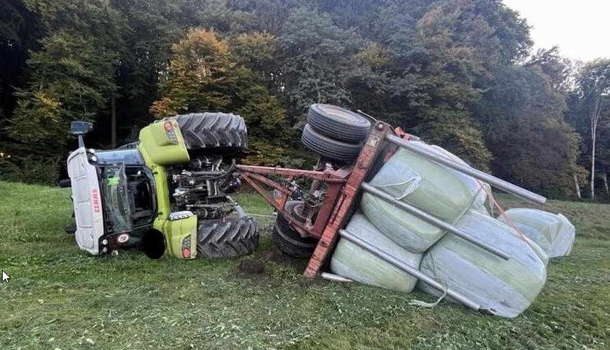 Am Dienstagnachmittag, 14. Oktober 2025, kam es in Beringen SH zu einem Verkehrsunfall mit einem landwirtschaftlichen Gespann. Gegen 16.00 Uhr war ein Mann mit einem Traktor und einem Anhänger, beladen mit insgesamt 17 Siloballen, auf dem Lauferberg in Richtung Beringen unterwegs.