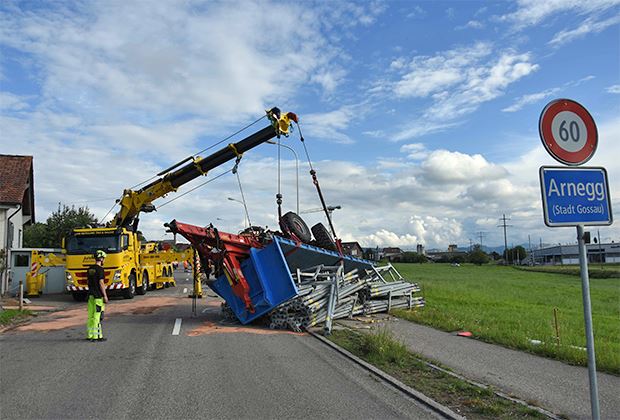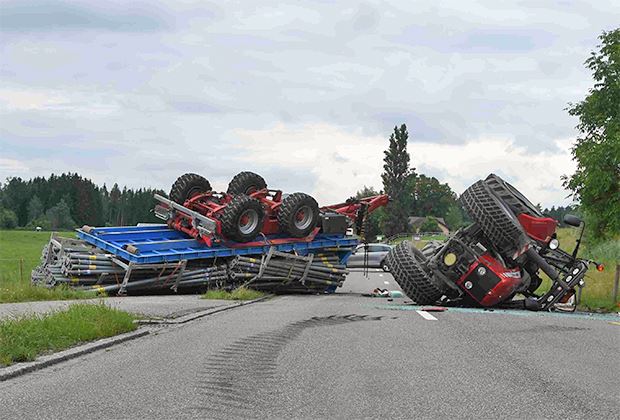 Ein heftiger Unfall ereignete sich am Dienstagnachmittag bei Arnegg SG. Ein Anhänger kam ins Schlingern. In der Folgen kippten der Traktor und der Anhänger um. Der Fahrer blieb unverletzt. -> Mit Video