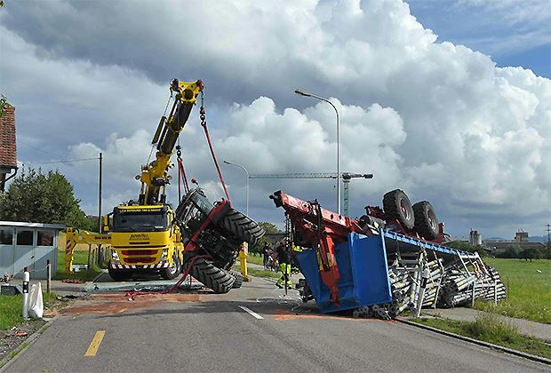 Die Fahrzeugkombination überschlug sich in der Folge. Dabei löste sich der Anhänger vom Traktor, drehte sich entgegen der Fahrrichtung und kam mit den Rädern nach oben zu liegen. Die Zugmaschine kippte nach links und kam auf der Seite liegend zum Stillstand.