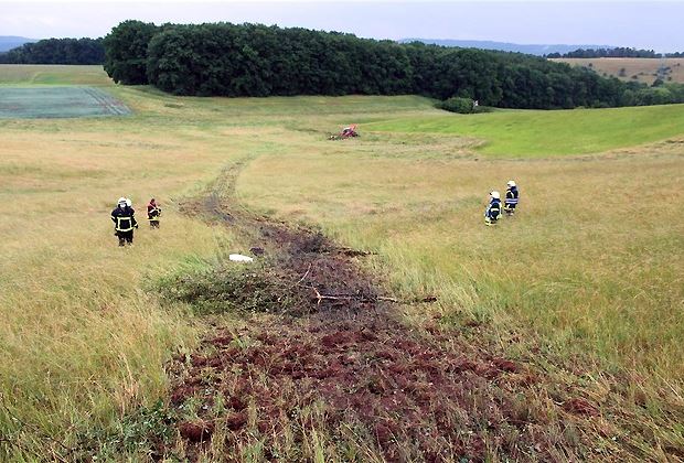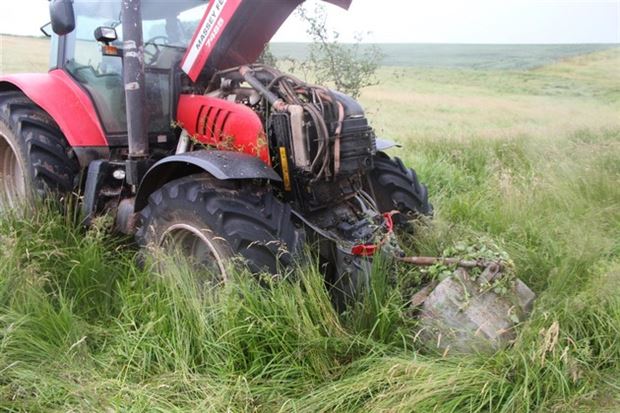 Aus noch unbekannten Gründen verlor der Mann die Kontrolle über das Fahrzeug. Der Schlepper zog eine etwa 800 Meter lange Spur über mehrere Felder, wobei es Unterholz aus Baum- respektive Heckenbestand durchbrach. Auf einer ebenen Wiese kam der Traktor zum Stillstand.