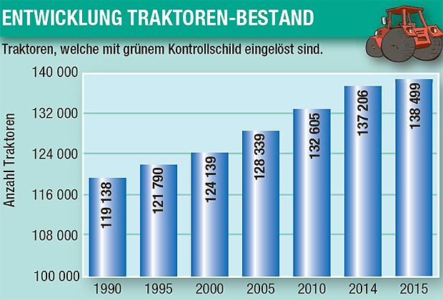 Die Anzahl Traktoren hat in der Schweiz in den letzten Jahrzehnten stetig zugenommen. Dies im Gegensatz zu den Bauernbetrieben. Während die Anzahl Bauernhöfe von 2000 bis 2014 von 70'537 auf 54'046 Betriebe um 23,4 Prozent oder 16'491 Bauernhöfe zurückging, nahm der Traktorenbestand in derselben Zeit um 13'070 Traktoren oder rund 9 Prozent zu.