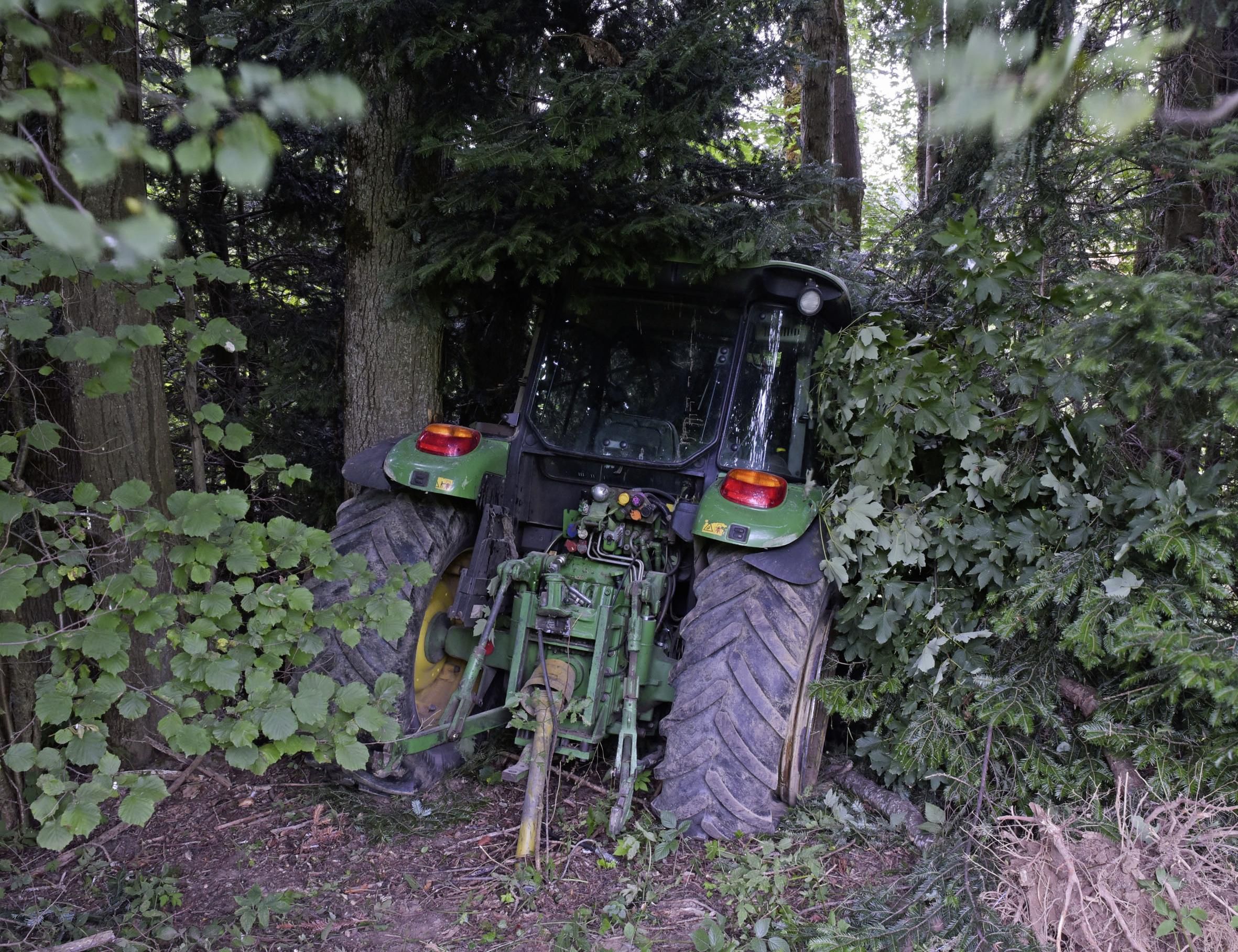 Dabei kippte der mit Holzschnitzeln beladene Anhänger zur Seite und blieb in einer Wiese liegen. Der Traktor überschlug sich. Dabei wurde der 55-jährige Lenker aus der Fahrerkabine geschleudert. Der Traktor fuhr anschliessend führerlos 100 Meter eine Wiese hinunter und kam schliesslich in einem Waldstück zum Stillstand.