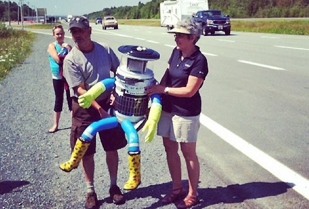 Der Roboter «HitchBot» kommt auf seiner Reise per Anhalter quer durch Kanada gut voran. Rund zwei Wochen nach Beginn der Fahrt hat das computergesteuerte Kunstwesen aus Schwimmnudeln, Gummistiefeln, einem Eimer, einer Küchenhaube und ähnlichen Einzelteilen etwa die Hälfte der Strecke zurückgelegt.