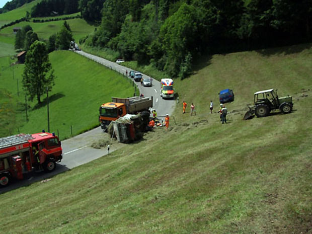 Der Fahrzeuglenker geriet aber über den Feldweg hinaus. Der Transporter mit dem Emd rutschte ab und überschlug sich mehrmals. Erst auf der Hauptstrasse kam das Fahrzeug zum Stillstand. Der Verunfallte zog sich schwere Verletzungen zu und musste mit der Rega ins Spital geflogen werden.