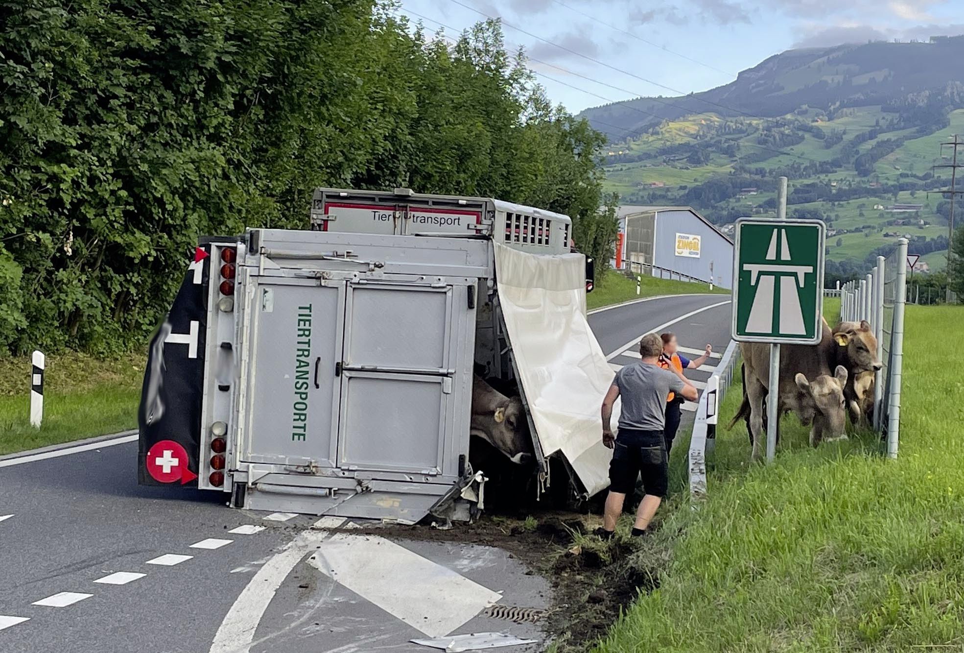 Im Anhänger befanden sich ein Dutzend Kühe und Rinder. Sie haben den Unfall unversehrt überstanden. Bis zu ihrem Weitertransport grasten diese am Strassenrand. Der Anhänger jedoch blockierte die Einfahrt. Diese blieb mehrere Stunden gesperrt.