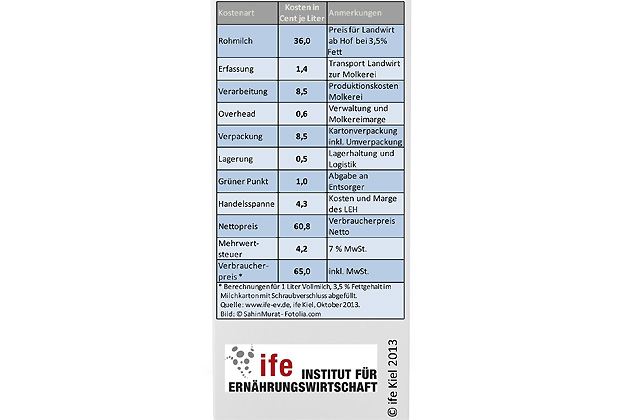 Dies zeigt eine Untersuchung des Kieler Instituts für Ernährungswissenschaft (ife). Die Marge des Detailhandels beläuft sich auf 4,3 Cent (rund 5,3 Rappen). Diese sei vergleichsweise niedrig, enthalte sie doch die Kosten für Logistik, Handling und die Kühlung der Trinkmilch im Laden, hält das Ife fest. Die Verarbeitung der Milch in den Molkereien kostet 8,5 Cent (10,5 Rp.), die Verpackung schlägt mit 8,5 Cent (10,5 Rp.) und Lagerhaltung/Logistik schlagen mit 0,5 Cent pro Liter zu Buche.
