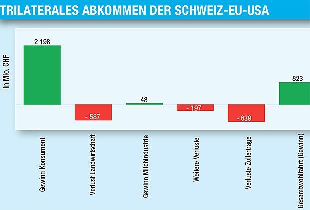 Die Studie räumt denn auch ein, dass bei einem trilateralen Freihandel mit EU und USA die Preise von landwirtschaftlichen Erzeugnissen um bis gegen 50% einbrechen würden. Namentlich die Preise von Weizen, Schweinefleisch, Raps und Rindfleisch würden stark einbrechen. Das hätte auch Folgen für die Importe. «Schliesst sich die Schweiz der TTIP an, steigen zwar die Importe — insbesondere von Getreide und Fleisch aus der EU. Im Gegenzug bieten sich der Schweiz neue Exportchancen, vor allem für Milchprodukte», schreibt die Igas in einer Mitteilung.