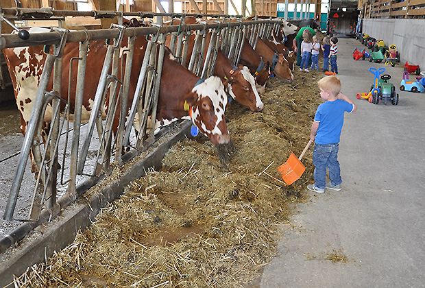Sie musste im Jahr 2008 aussiedeln. Ihr neuer Stall, der für rund 65 Milchkühe der Rassen Red Holstein und Normande Platz bietet, liegt leicht erhöht und gewährt einen guten Überblick auf das Dorf. Die Aussiedlung führte im Betrieb zu einer Neuausrichtung. Die Direktvermarktung wurde aufgegeben, Pfefferlis setzten fortan auf Lernangebote für Kinder im Alter von 3 bis 13 Jahren als zweiten Betriebszweig neben der Milchproduktion. Und das mit Erfolg.