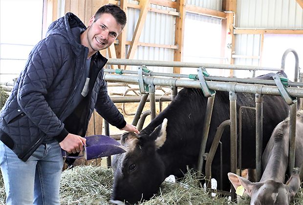 Diversifikation gleich mehr Arbeit? Nicht unbedingt: Landwirt Loïc Niederhauser will trotz grosser Leidenschaft für seinen Beruf genug Zeit für seine Familie haben. Und setzt deshalb auf Truten, Legehennen und Milchkühe.