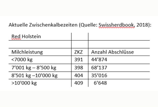 Das stetig steigende Leistungspotenzial der Schweizer Kühe lässt die Zwischenkalbezeiten jährlich ansteigen. Die Aussage «jedes Jahr ein Kalb» wird stets mit gesunden, fruchtbaren Tieren gleichgesetzt. Bei Milchkühen, welche hohe Leistungen erreichen, stellt sich jedoch die Frage, ob eine Verlängerung der Zwischenkalbezeiten nicht sinnvoller wäre. Wo liegt jedoch die optimale Zwischenkalbezeit je nach Milchleistung?