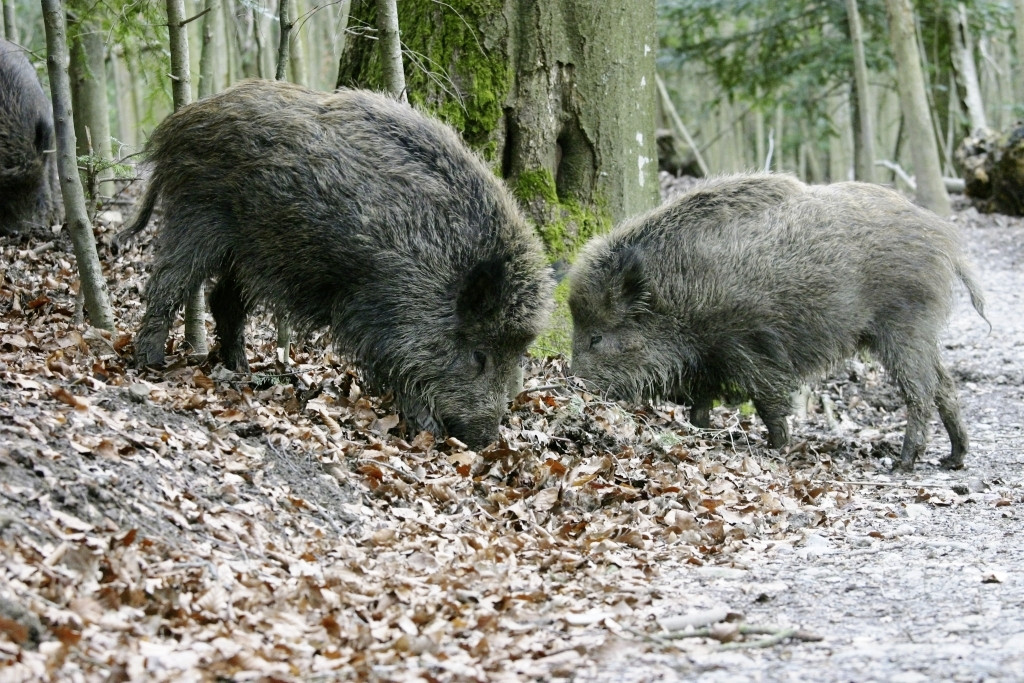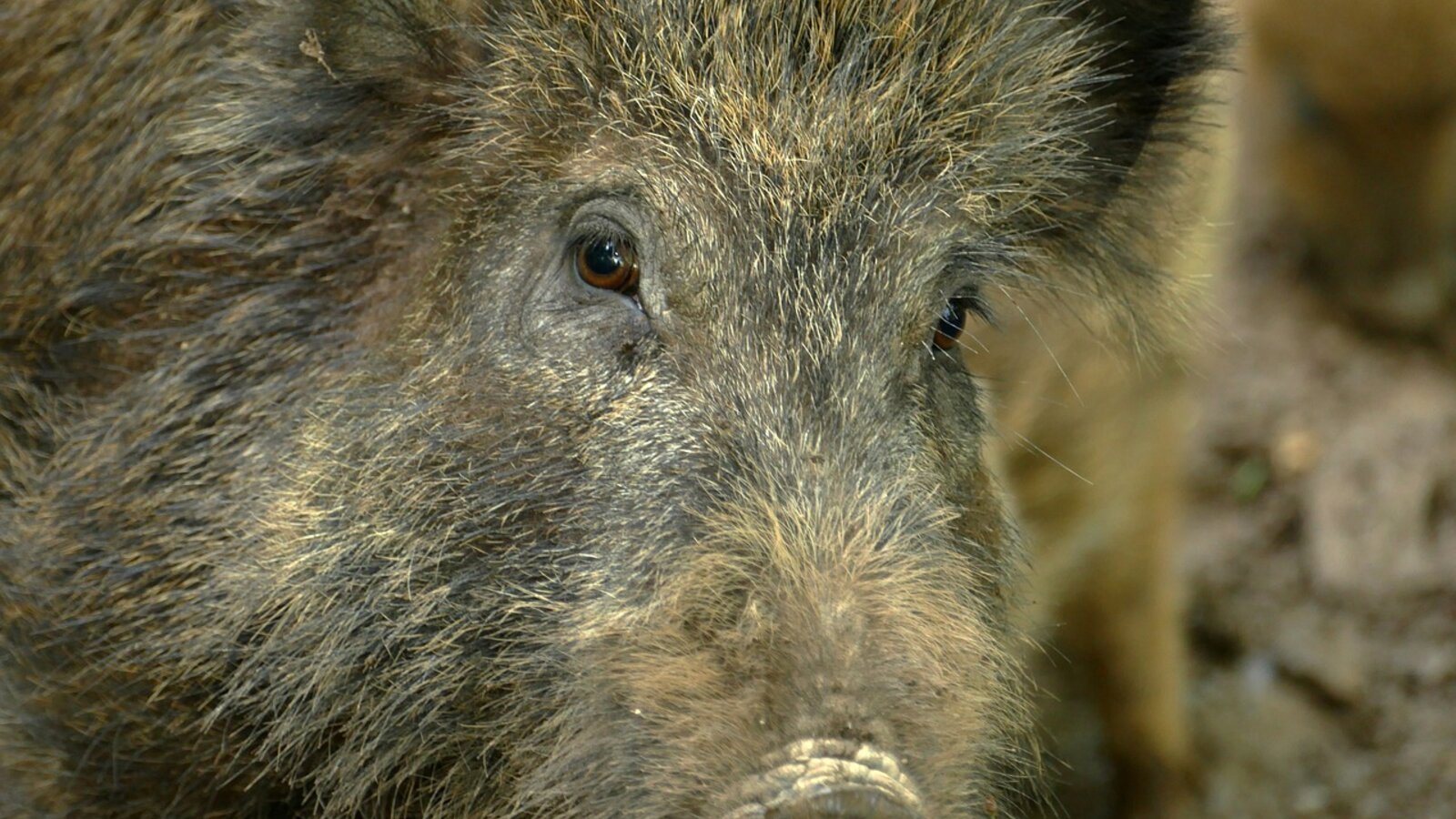 Mit ihrem Rüssel und den Eckzähnen wühlen die Wildschweine auf Wiesen und Feldern nach Engerlingen, Würmern und Mäusen.