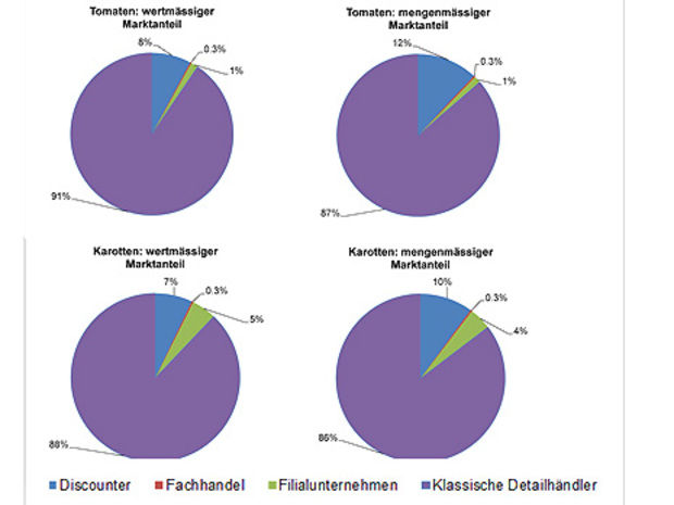 Die Gruppe der Fachgeschäfte ist beim Verkauf von Tomaten und Karotten zu vernachlässigen, weil sich ihr Marktanteil auf weniger als ein halbes Prozent beläuft.