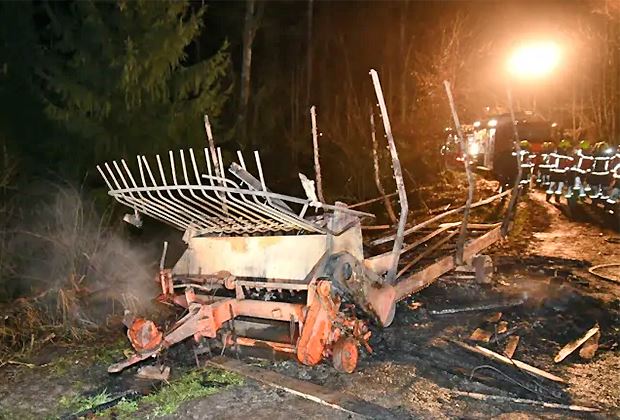 Die Feuerwehr benötigte einige Zeit, den Brandort mitten im Wald aufzufinden. Als sie beim Ladewagen eintraf, stand dieser bereits in Vollbrand. Das Gefährt war mit Holz, einer Matratze, Hausrat und Abfall beladen. Der Ladewagen erlitt einen Totalschaden.