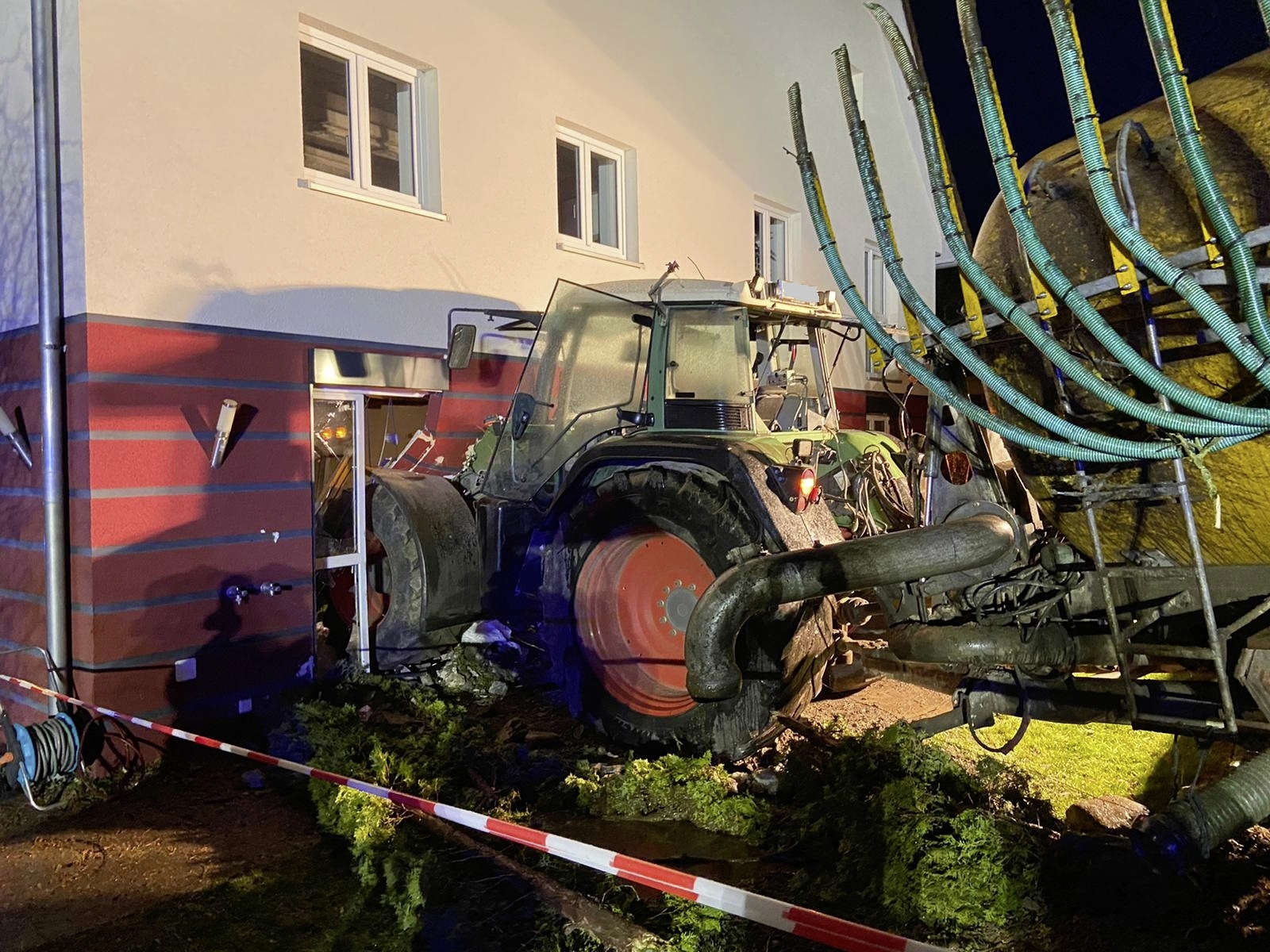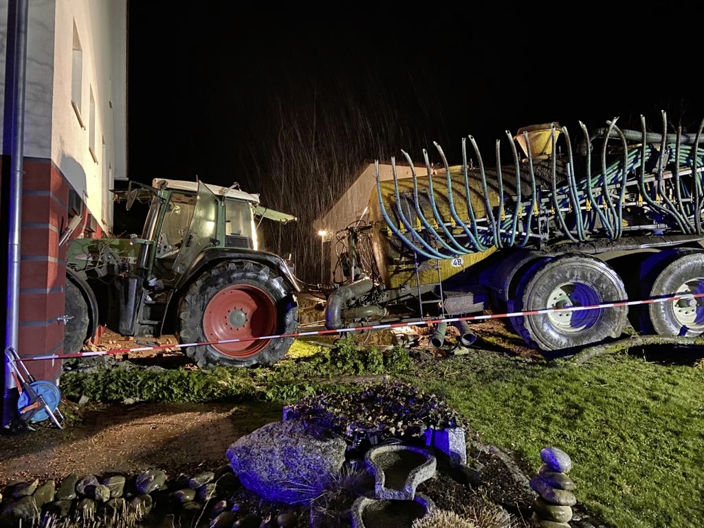Im süddeutschen Hüttenreute donnerte am Donnerstagabend ein Traktor mit angekoppelten Güllefass in ein Haus. Der Fahrer zog sich Verletzungen zu. Das Haus und der Traktor wurden massiv beschädigt.