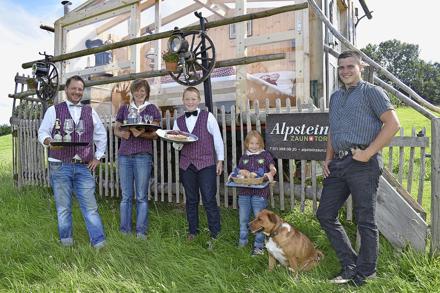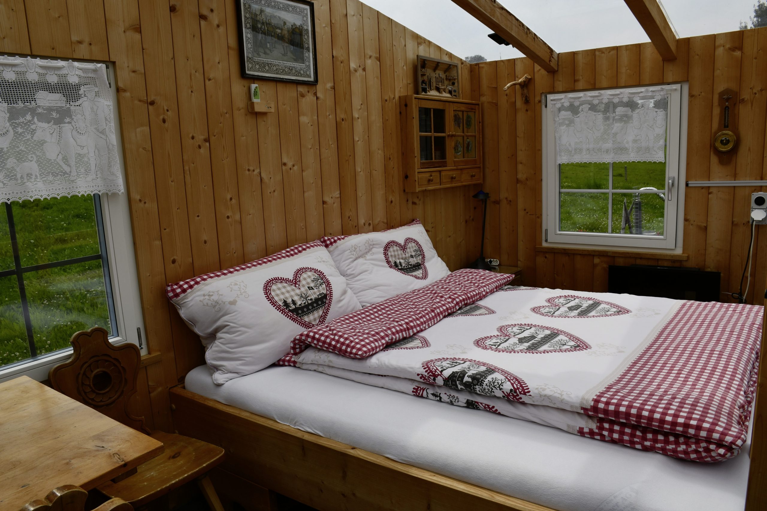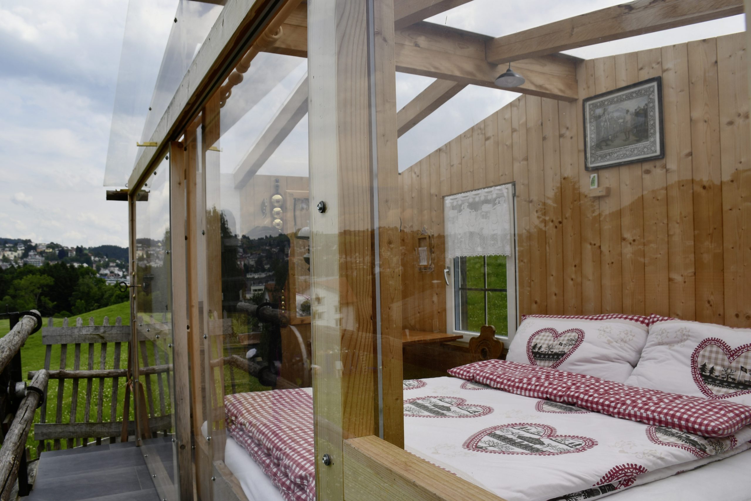 Neben dem Gästezimmer im Bauernhaus thront auf einer Wiese am Hang oberhalb vom Hof die «Alpenbritsche», ein romantisches Appenzeller Ein-Zimmer-Häuschen mit Doppelbett, Sitzecke und Holzofen. Das Plexiglasdach gibt den Blick in den Sternenhimmel frei. Drei Wände und eine Schiebetüre sorgen dafür, dass die Übernachtung auch bei Wind und Wetter zum Erlebnis wird. Gleich neben der «Alpenbritsche» steht ein Hot-Pot, ein zusätzliches Highlight, welches sich die meisten Gäste nicht entgehen lassen.