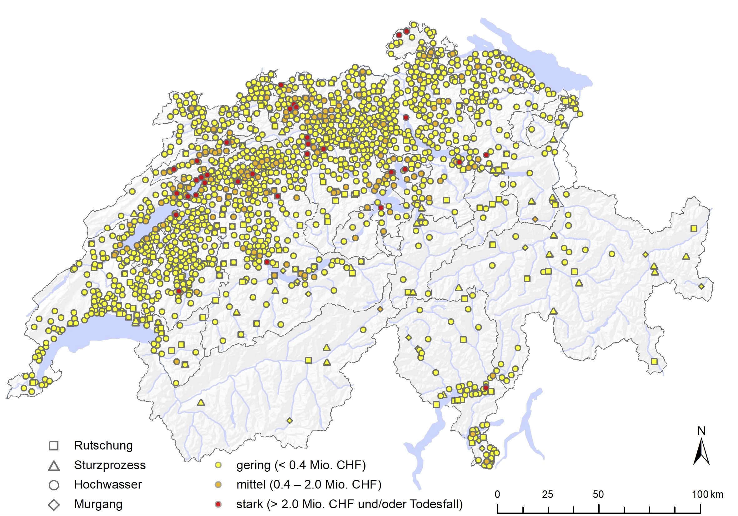 Die WSL sammelt seit 1972 systematisch Informationen über Umweltschäden. Die Datenbank enthält Angaben zu Schäden durch Hochwasser, Murgänge und Rutschungen. Seit 2002 werden auch Steinschlag, Fels- und Bergsturz erfasst. Schäden als Folge von Lawinen, Schneedruck, Erdbeben, Blitzschlag, Hagel, Sturm und Trockenheit werden in den Auswertungen nicht berücksichtigt.