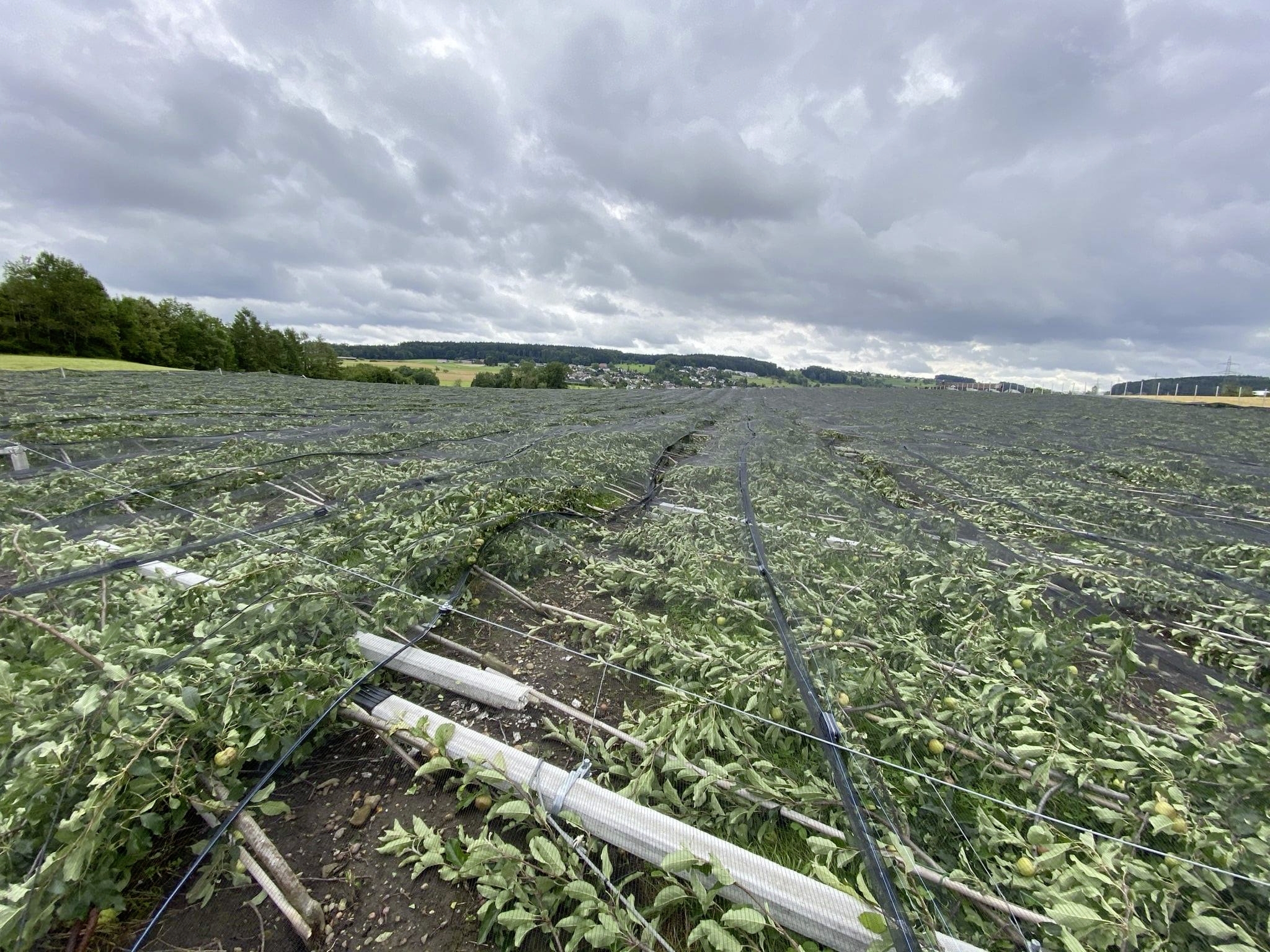 Auch über Dorf Aesch in der Nähe von Zürich bliess ein heftiger Wind. Der Landwirtschaftsbetrieb der Familie Mörgeli war von den Sturmböen mit bis zu 120 km/h und dem Hagel massiv betroffen. Die rund 2 Hektaren grosse Obstanlage wurde dem Erdboden gleichgemacht. Wie die «Tamedia»-Zeitungen berichten, haben die eingestürzte Hagelschutzanlage mit ihrer an Ankern und Betonpfählen befestigten Drahtkonstruktion die insgesamt 8000 Bäumchen unter sich begraben.