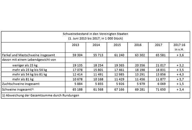 Nach Angaben des amerikanischen Landwirtschaftsministeriums (USDA) wurden zum Stichtag 1. Juni 2017 insgesamt 71,65 Millionen Schweine in den Staaten gehalten. Das waren nicht nur 2,37 Millionen Tiere oder 3,4 % mehr als zwölf Monate zuvor, sondern so viele wie noch nie in einem Juni seit Beginn der statistischen Aufzeichnungen im Jahr 1964.