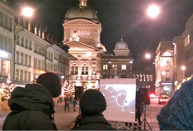 Mit dem Segen der Stadtbehörden zeigte der Verein «Tier im Fokus» am Donnerstagabend in Bern ein Video gegen die Schweinehaltung.