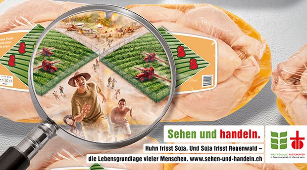 In ihrer ökumenischen Kampagne 2015 prangern das katholische Hilfswerk Fastenopfer und das reformierte Brot für alle die Futtermittelproduktion in fernen Ländern und den Verzehr von grossen Mengen Fleisch an. Die industrielle Nahrungsmittelherstellung sei die wichtigste Ursache für den Klimawandel, halten die Organisationen fest. Es gehe ihnen darum, kritische Konsumenten zu fördern, sagt Matthias Dörnenburg von Fastenopfer.