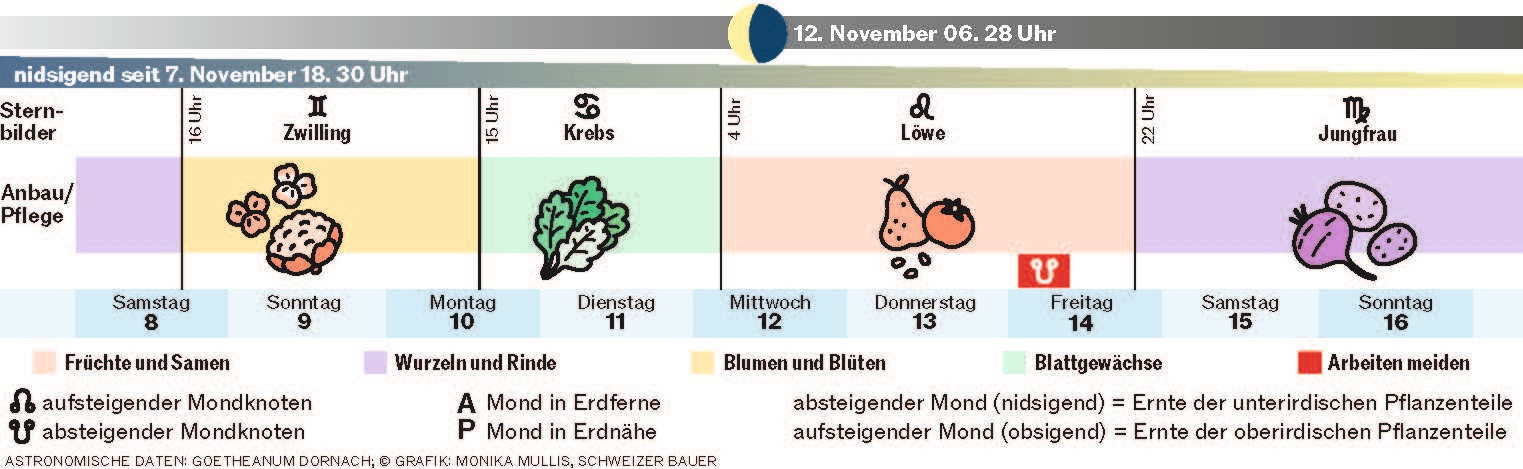 Der 10. November markiert im Mondkalender den Wechel von einem Blütentag zu einem Blatttag. Dieser Kalender basiert auf dem Mondlauf und der Annahme, dass durch die unterschiedlichen Anziehungskräfte des Mondes vier Elemente wirksam werden, welche vier unterschiedliche Pflanzenteile Blüte, Blatt, Wurzel, und Frucht fördern. An Blatttagen werden die Pflanzen gepflegt, die eine starke Ausprägung im Blattbereich haben, also Kohlarten, Wintersalate, aber auch Futterpflanzen.