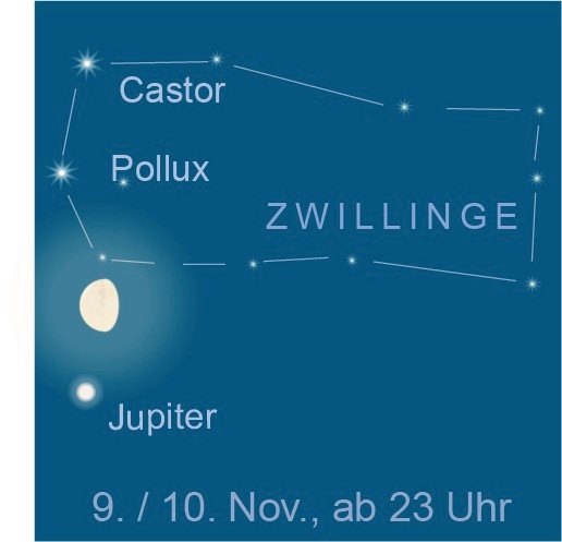 Wartet man bis in die späteren Abendstunden, so geht im Nordosten Jupiter in den Zwillingen auf. In der Nacht vom 9. auf den 10. November stellt sich der Mond dazu. So bildet sich mit den beiden Hauptsternen der Zwillinge eine Viererreihe. Sie wandert die ganze Nacht von über den Süden nach Nordwesten. Jupiter steht noch einige Monate an diesem Ort, sodass sich monatlich diese Begegnung ergibt.